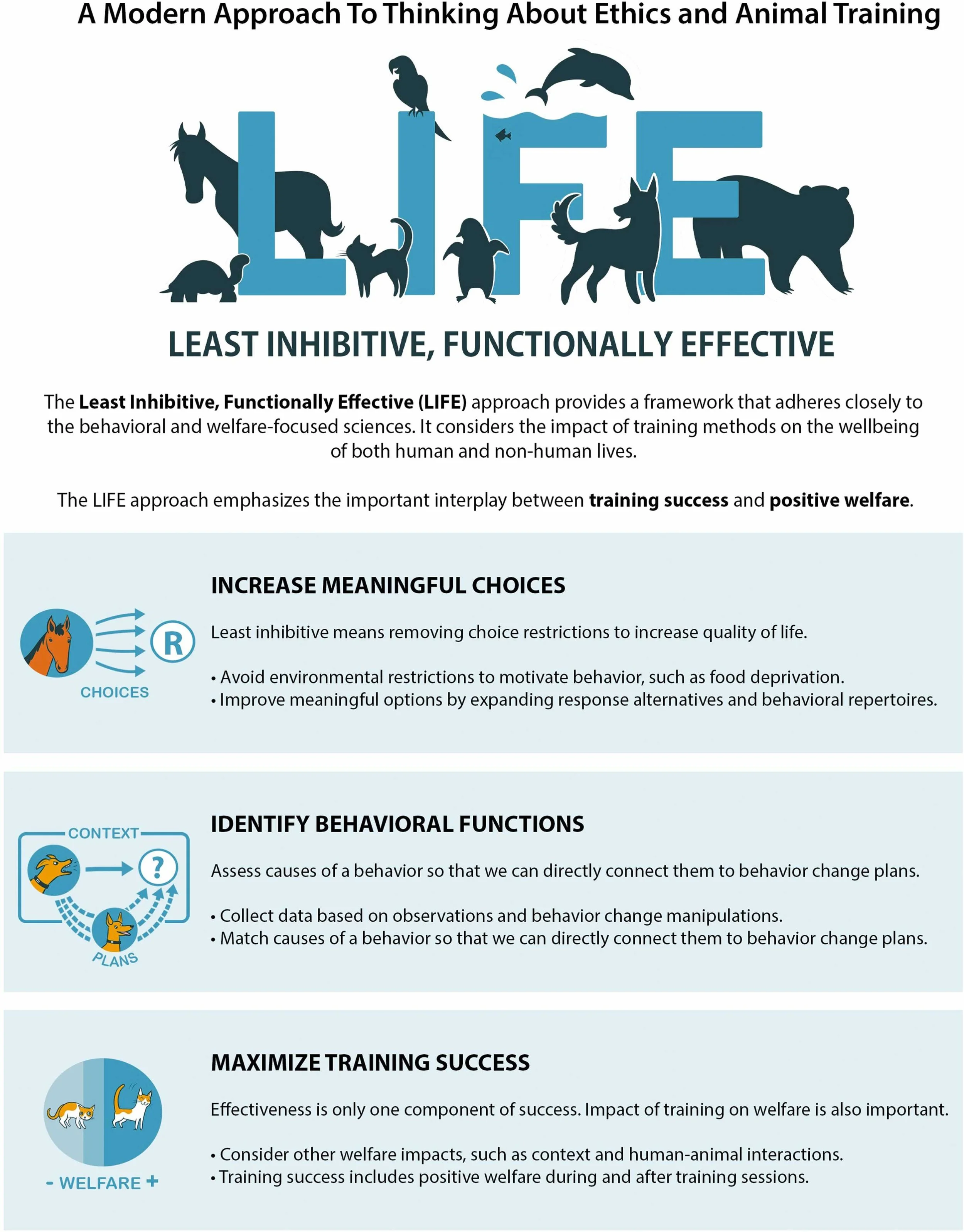 An infographic explaining the ‘LIFE’ approach to behavior change. The top of the page features a subheading reading “A Modern Approach To Thinking About Ethics and Animal Training.” Below that subheading is the title “LIFE: LEAST INHIBITIVE, FUNCTIONALLY EFFECTIVE.” Dark blue silhouettes of a turtle, horse, cat, parrot, penguin, dolphin, dog, and a bear are shown around “LIFE” both behind and in front of the text.